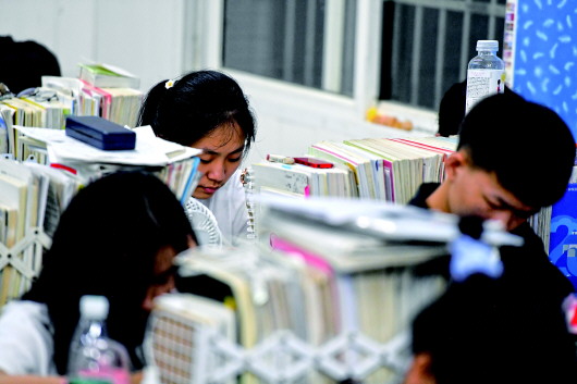 在湖南岳陽(yáng)平江縣第二中學(xué),向欣儀(中)在教室復(fù)習(xí)功課,備戰(zhàn)高考(7月3日攝)。記者陳澤國(guó)攝