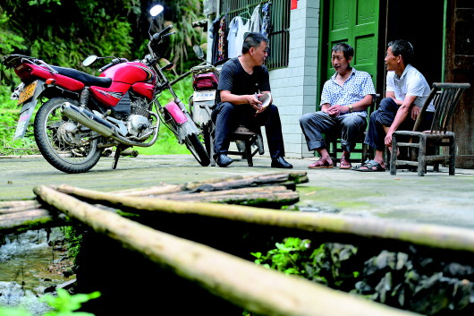 在湖南岳陽(yáng)平江縣大洲鄉(xiāng)上洲村,向彩旺(左)在貧困戶(hù)家中了解情況(7月3日攝)。記者陳澤國(guó)攝