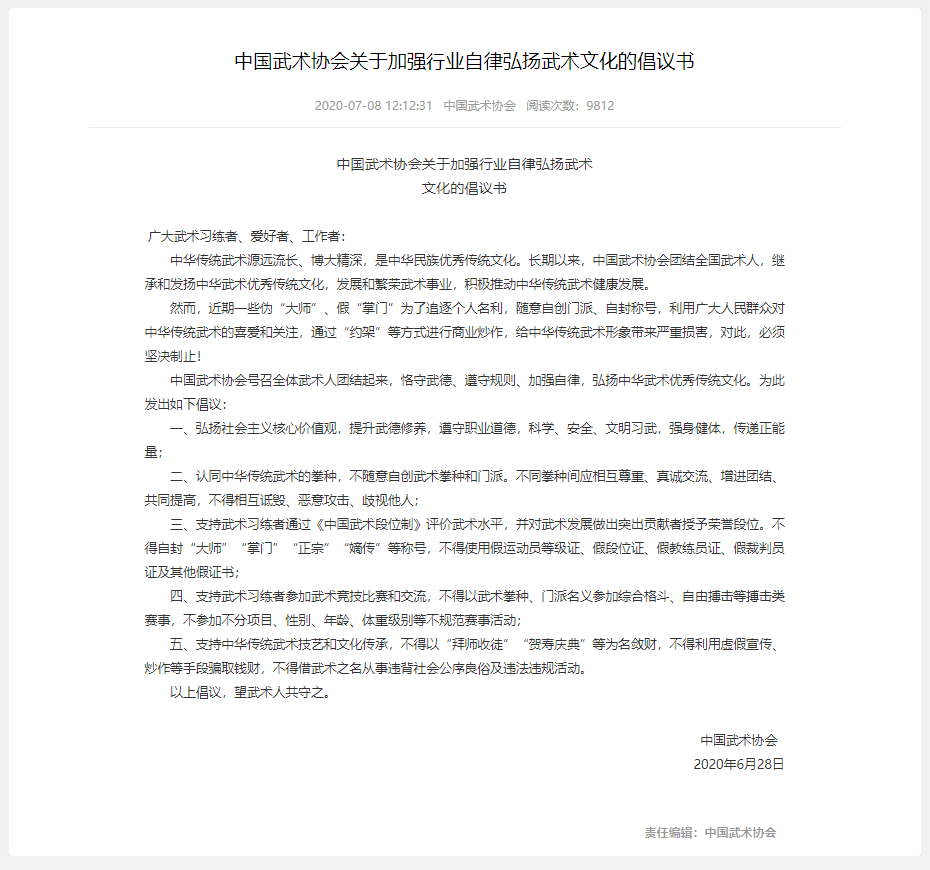 中國(guó)武術(shù)協(xié)會(huì)在其網(wǎng)站發(fā)布《關(guān)于加強(qiáng)行業(yè)自律弘揚(yáng)武術(shù)文化的倡議書》,號(hào)召全體武術(shù)人團(tuán)結(jié)起來(lái),恪守武德、遵守規(guī)則、加強(qiáng)自律,弘揚(yáng)中華武術(shù)優(yōu)秀傳統(tǒng)文化,并倡議武術(shù)習(xí)練者不得自封“大師”“掌門”“正宗”“嫡傳”等稱號(hào),不得以武術(shù)拳種、門派名義參加綜合格斗、自由搏擊等搏擊類賽事,不參加不分項(xiàng)目、性別、年齡、體重級(jí)別等不規(guī)范賽事活動(dòng)。