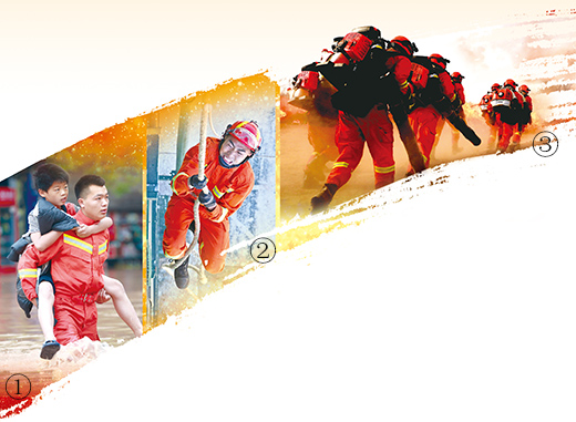 圖①:今年6月底,受暴雨影響,重慶市龍?zhí)逗友鼐€地區(qū)被淹。圖為消防隊員踏水背出受困群眾。肖樂峰攝(人民視覺) 圖②:在山東省煙臺市消防救援支隊培訓(xùn)基地,消防隊員正在參加繩索攀爬比賽。孫文潭攝(人民視覺) 圖③:今年5月,甘肅省森林消防總隊張掖支隊開展了實戰(zhàn)滅火演練。圖為消防隊員奔赴演練火場。張小軍攝(人民視覺)