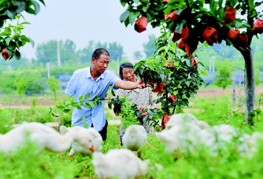 6月11日,李健(左)在桐柏縣埠江鎮(zhèn)付樓村黃金梨種植基地查看黃金梨套袋情況。本報記者郝源攝