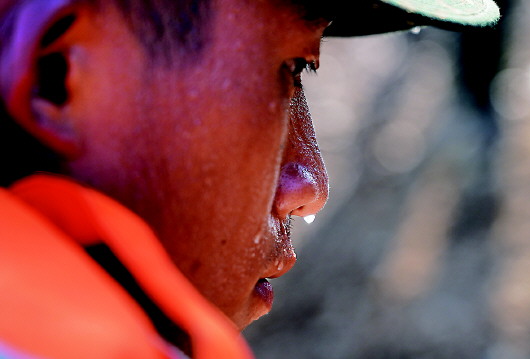 武警江西總隊上饒支隊的一名戰(zhàn)士臉上流下的汗水(7月14日攝)。新華社記者萬象攝