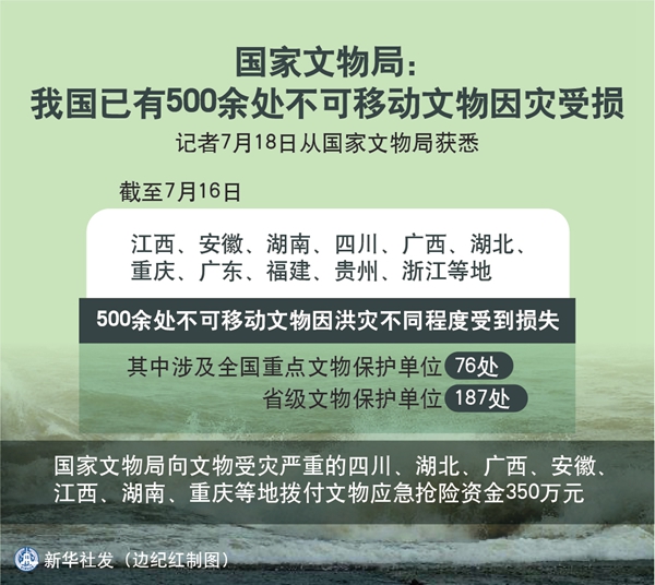 新華社北京7月18日電(記者施雨岑)記者18日從國(guó)家文物局獲悉,截至7月16日,江西、安徽、湖南、四川、廣西、湖北、重慶、廣東、福建、貴州、浙江等地500余處不可移動(dòng)文物因洪災(zāi)不同程度受到損失,其中涉及全國(guó)重點(diǎn)文物保護(hù)單位76處、省級(jí)文物保護(hù)單位187處。
