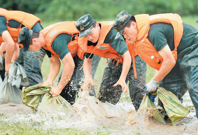 7月11日,武警江西總隊(duì)機(jī)動(dòng)支隊(duì)官兵在鄱陽縣江家?guī)X村昌江圩堤傳遞沙袋,封堵管涌。曹先訓(xùn)攝(人民視覺)