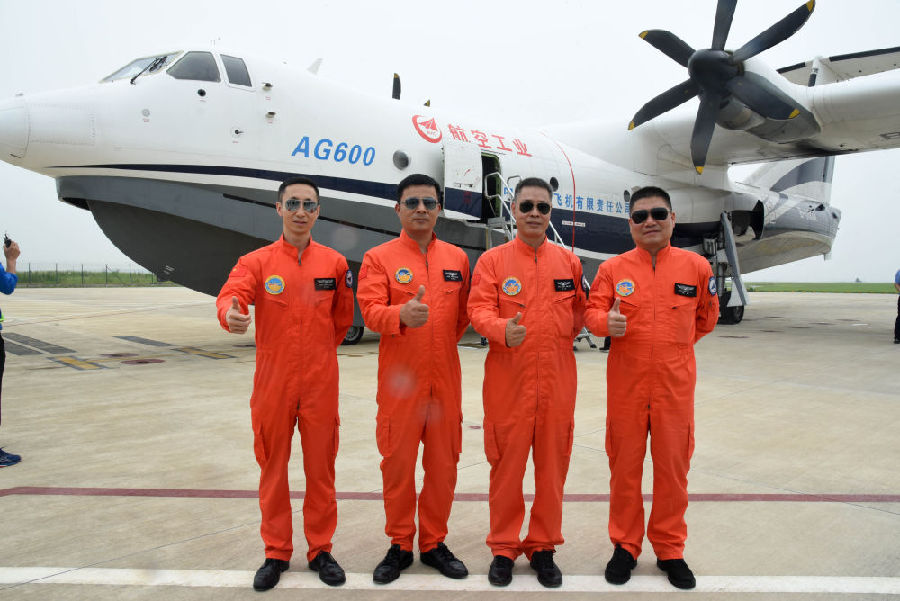 7月26日,機(jī)組人員在水陸兩棲飛機(jī)AG600成功進(jìn)行海上首飛返回日照山字河機(jī)場(chǎng)后合影。新華社記者 王凱 攝