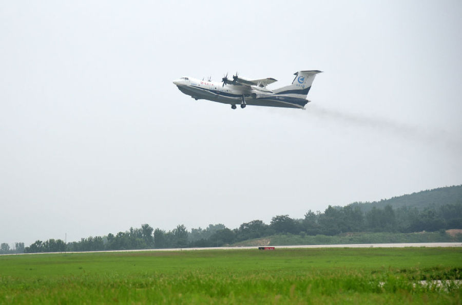 7月26日,水陸兩棲飛機(jī)AG600在日照山字河機(jī)場(chǎng)起飛。新華社記者 王凱 攝