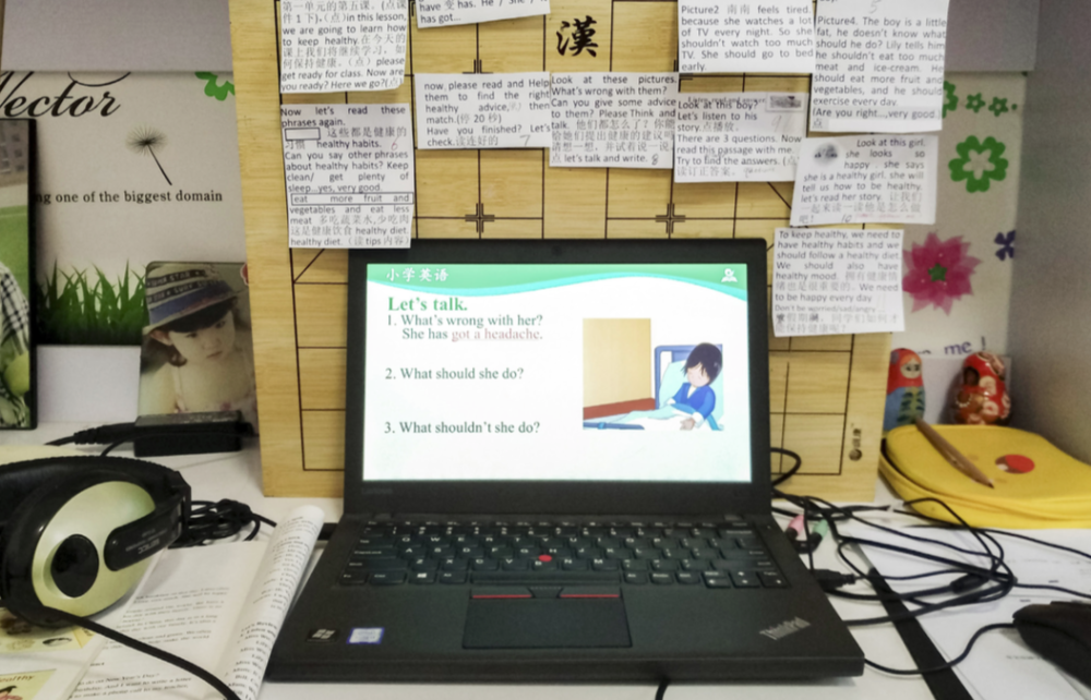 2月17日,北京中關(guān)村第三小學(xué)英語老師魯鳳玲在家中為學(xué)生錄制“國家中小學(xué)網(wǎng)絡(luò)云平臺”教學(xué)內(nèi)容,電腦附近貼滿了用來提詞的紙條