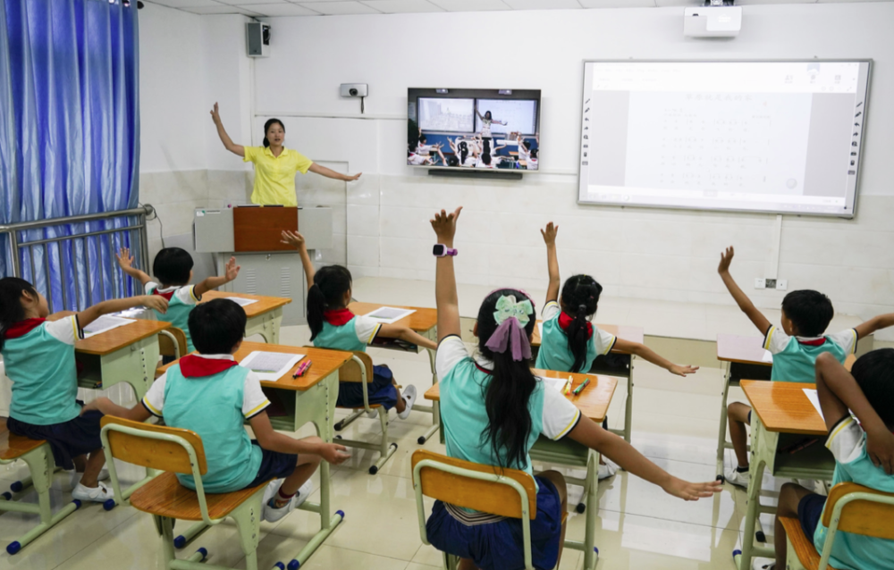 三沙市永興學(xué)校老師張利帶著學(xué)生,通過遠程在線教育系統(tǒng),與??谑袨I海第九小學(xué)的老師和學(xué)生一起上音樂課 (沈伯韓/攝)