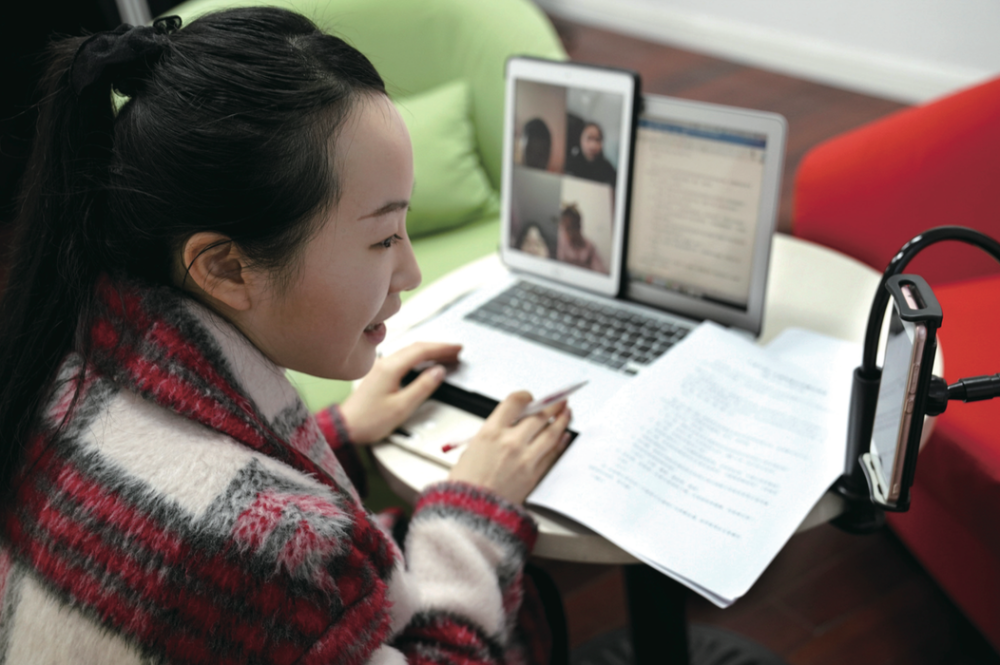 2月25日,上海市盧灣中學(xué)六(五)班的班主任陳溦雯與學(xué)生們?cè)诰€互動(dòng),圍繞防疫主題開展一堂“云班會(huì)” ( 劉穎/攝 )