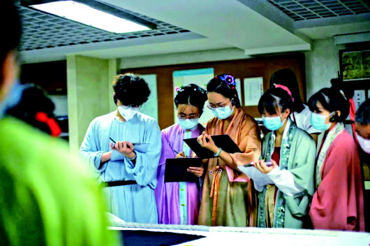 漢服商家、研究者們在中國絲綢博物館仔細記錄文物細節(jié)。(陳潤熙/攝)