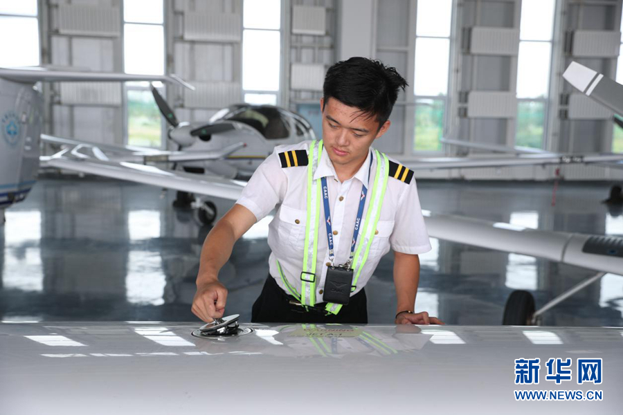 圖為8月6日,內(nèi)蒙古飛行學(xué)院飛行學(xué)員在起飛前檢查航油情況。新華網(wǎng)記者焦鵬 攝