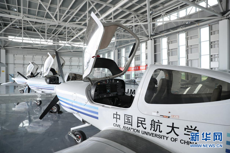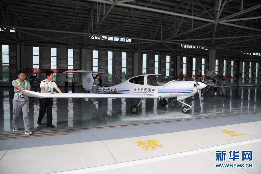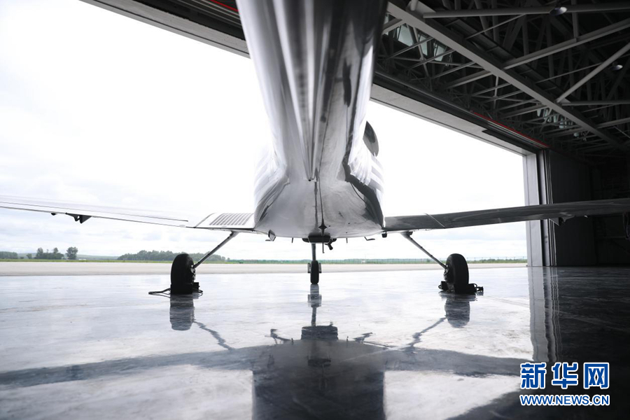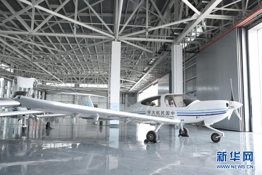 圖為中國民航大學(xué)內(nèi)蒙古飛行學(xué)院機(jī)庫中待飛的單發(fā)DA40D飛機(jī)。新華網(wǎng)記者焦鵬 攝