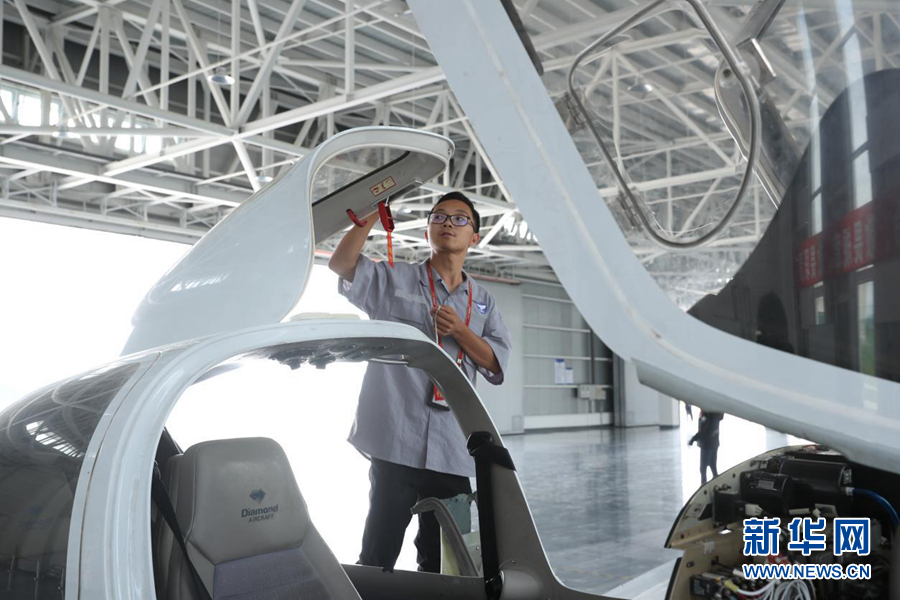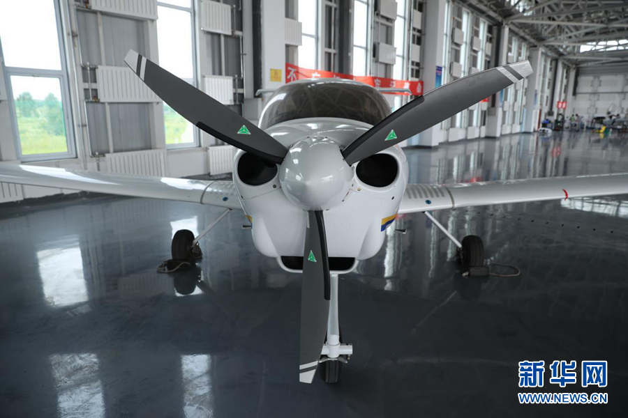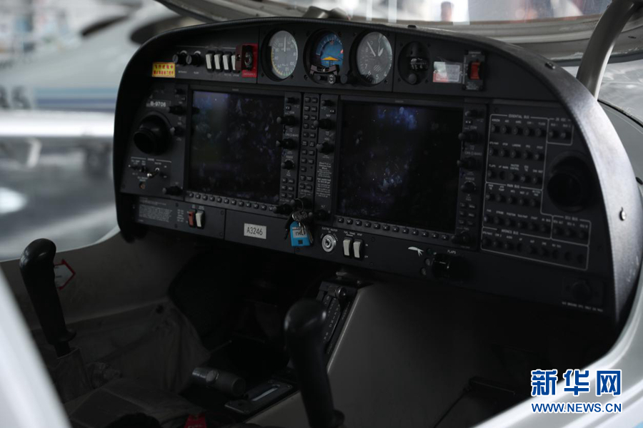 圖為機(jī)庫中待飛的單發(fā)DA40D飛機(jī)。新華網(wǎng)記者焦鵬 攝