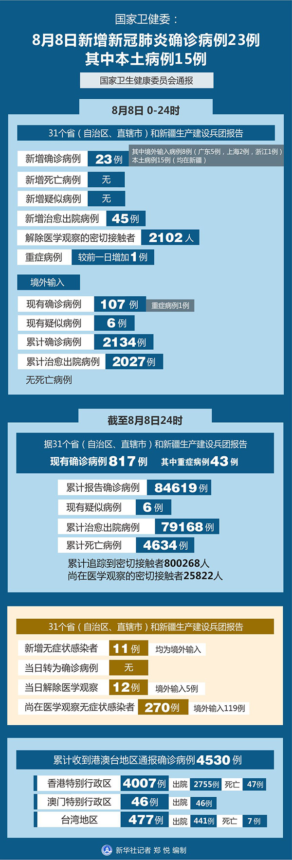 截至8月8日24時(shí),據(jù)31個(gè)?。ㄗ灾螀^(qū)、直轄市)和新疆生產(chǎn)建設(shè)兵團(tuán)報(bào)告,現(xiàn)有確診病例817例(其中重癥病例43例),累計(jì)治愈出院病例79168例,累計(jì)死亡病例4634例,累計(jì)報(bào)告確診病例84619例,現(xiàn)有疑似病例6例。累計(jì)追蹤到密切接觸者800268人,尚在醫(yī)學(xué)觀察的密切接觸者25822人。