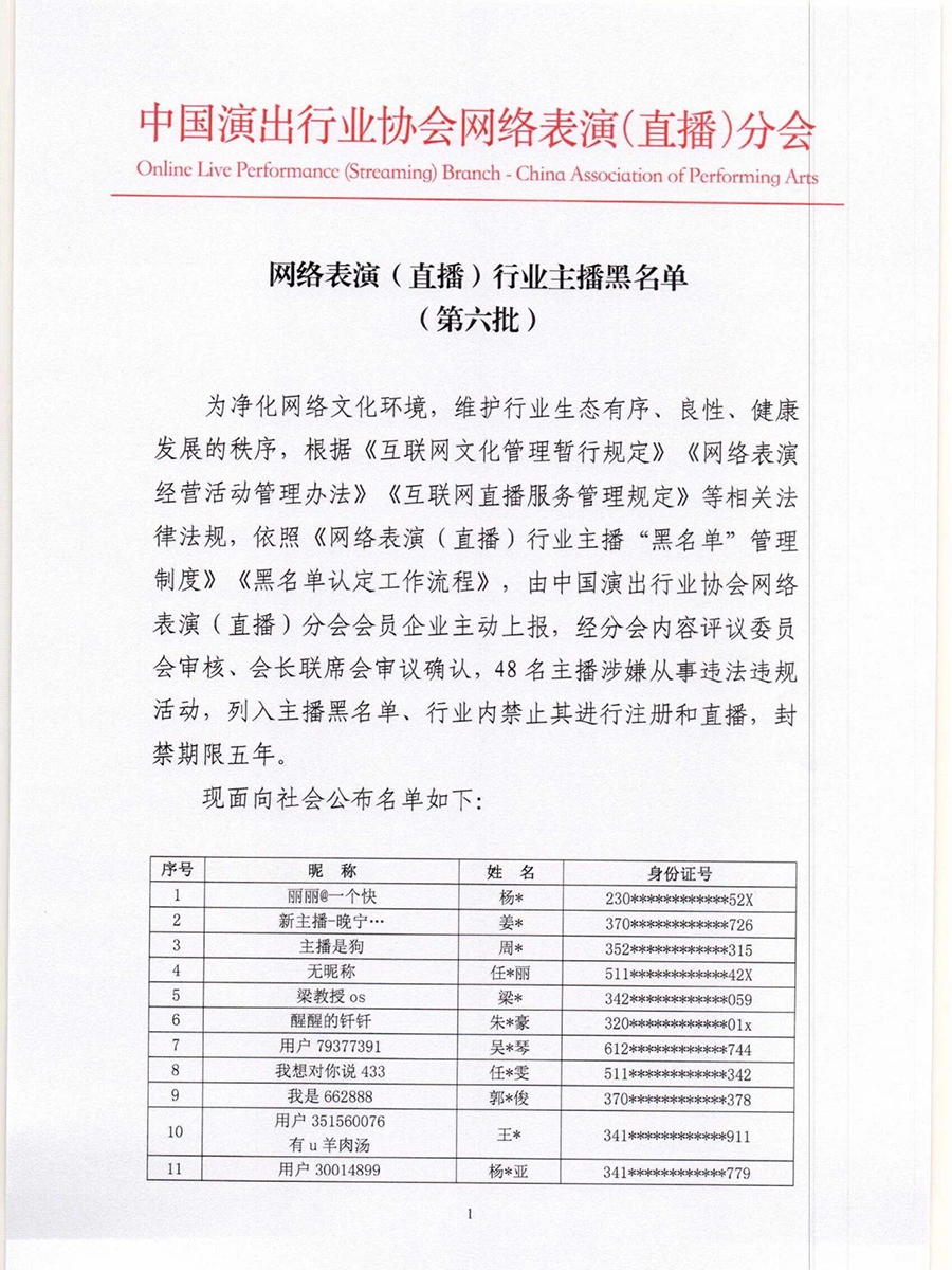 根據(jù)《互聯(lián)網(wǎng)文化管理暫行規(guī)定》《網(wǎng)絡(luò)表演經(jīng)營(yíng)活動(dòng)管理辦法》《互聯(lián)網(wǎng)直播服務(wù)管理規(guī)定》等相關(guān)法律法規(guī),按照《網(wǎng)絡(luò)表演(直播)行業(yè)主播“黑名單”管理制度》《黑名單認(rèn)定工作流程》規(guī)定,中國(guó)演出行業(yè)協(xié)會(huì)網(wǎng)絡(luò)表演(直播)分會(huì)現(xiàn)向社會(huì)公布第六批主播黑名單,被列入黑名單的主播將在行業(yè)內(nèi)禁止注冊(cè)和直播,封禁期限5年。(總臺(tái)央視記者 曹巖)