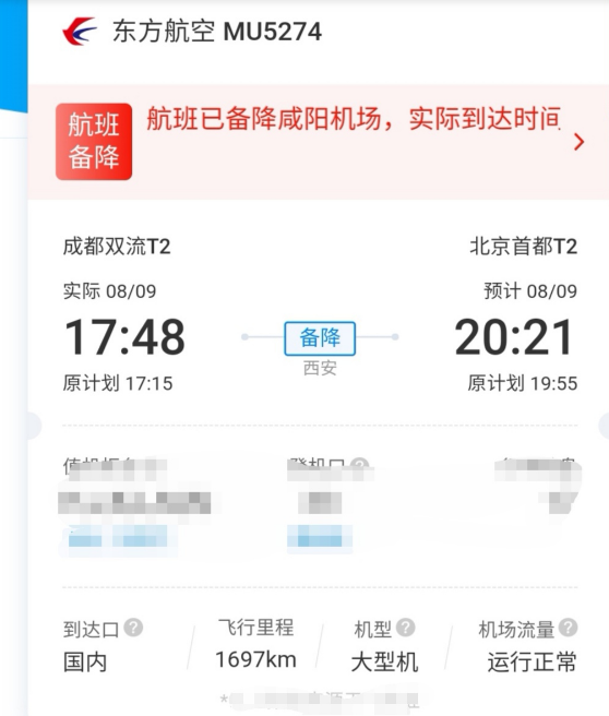 9日傍晚備降西安的東航MU5274次航班上的乘客已更換飛機(jī),于9日21:43,從西安咸陽國際機(jī)場起飛前往目的地北京。