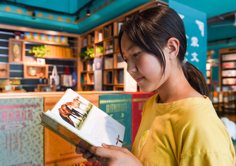 8月4日,錫林花在錫林浩特市的新華書店內(nèi)閱讀與蒙古馬文化有關(guān)的書籍。