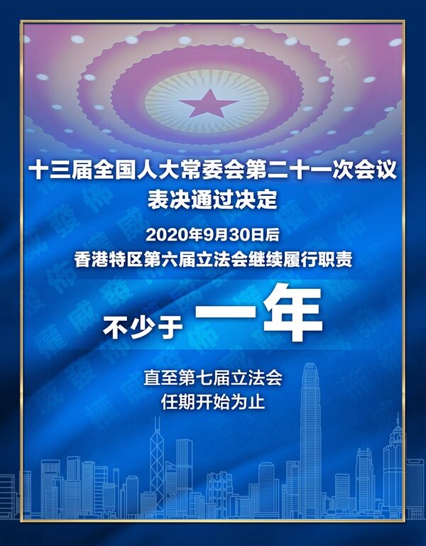 根據(jù)決定,2020年9月30日后,香港特別行政區(qū)第六屆立法會繼續(xù)履行職責(zé),不少于一年,直至香港特別行政區(qū)第七屆立法會任期開始為止。香港特別行政區(qū)第七屆立法會依法產(chǎn)生后,任期仍為四年。