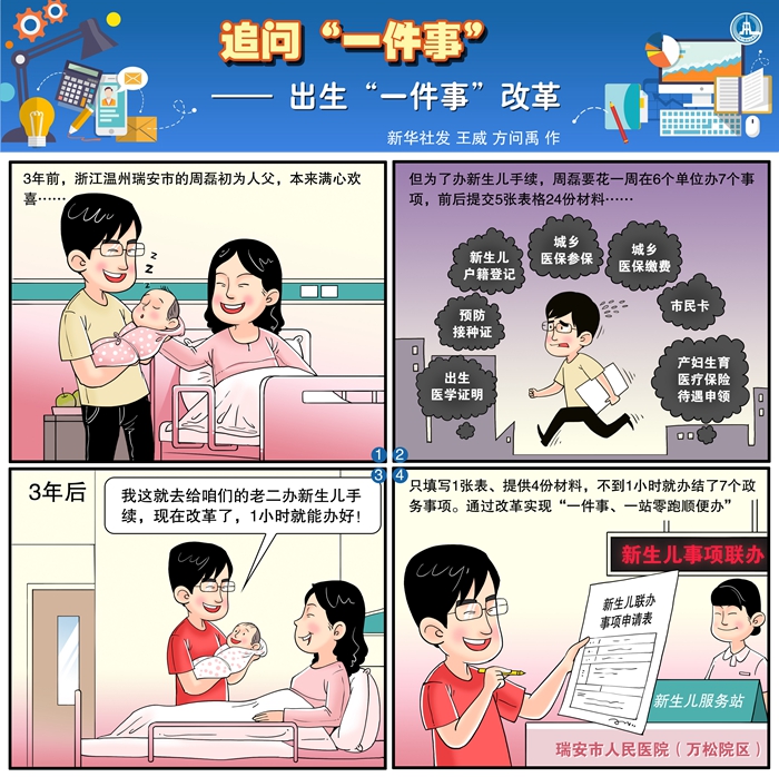 從6個(gè)部門的5張表格、24份材料,到群眾生活中的“一件事、一站零跑順便辦”,2019年7月,瑞安出生“一件事”改革經(jīng)驗(yàn)開始在浙江全省推廣。