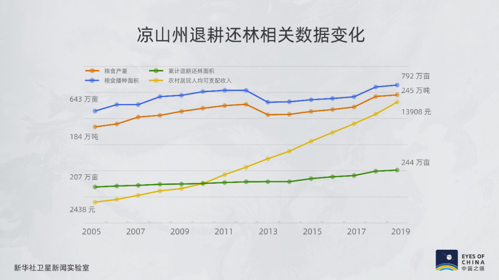 退耕還林后,涼山的實(shí)際播種面積從2004年的約600萬畝,增加到2019年的780萬畝。