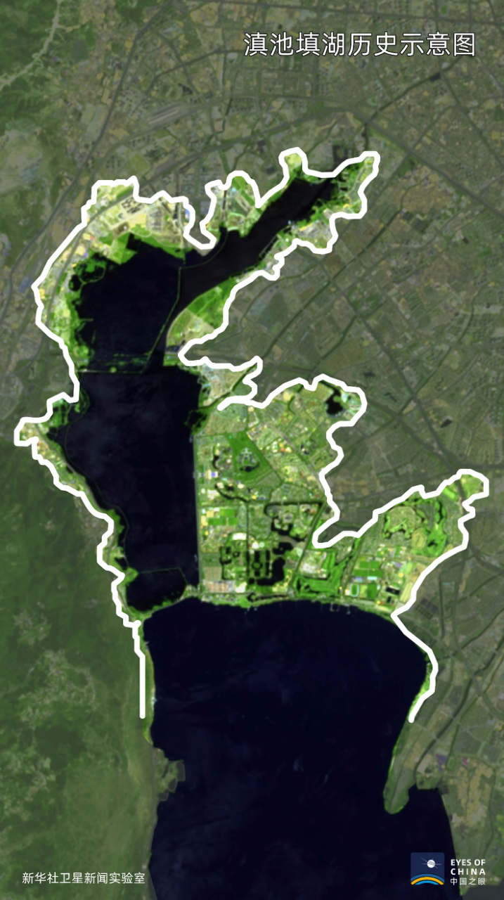 ↑滇池北部填湖示意圖,白線內(nèi)土地為上世紀(jì)60年代后填湖所得。
