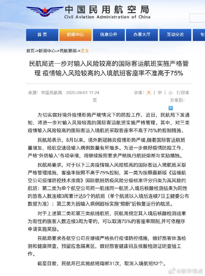 民航局表示,8月以來,境外新冠肺炎疫情形勢(shì)嚴(yán)峻,隨著國(guó)際客運(yùn)航班量增加,經(jīng)航空途徑輸入病例數(shù)量有所增多。為進(jìn)一步做好疫情防控工作,嚴(yán)格“外防輸入”各項(xiàng)舉措,將繼續(xù)按照要求嚴(yán)格執(zhí)行航班熔斷與獎(jiǎng)勵(lì)措施。