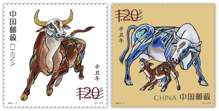 《辛丑年》特種郵票由著名畫家姚鐘華先生創(chuàng)作,延續(xù)了第四輪生肖郵票的“家國(guó)”理念。第一枚名為“奮發(fā)圖強(qiáng)”,描繪了雄壯有力、一往無(wú)前的奔牛形象。公牛四蹄揚(yáng)起,昂首向前,目光炯炯,表達(dá)出不畏艱險(xiǎn)、砥礪前行,為實(shí)現(xiàn)中華民族偉大復(fù)興而努力奮斗的寓意。第二枚名為“牛年大吉”,通過(guò)大牛與小牛舐?tīng)偾樯畹臏剀爱嬅?,向全?guó)人民傳遞家庭興旺和諧、團(tuán)圓美滿的美好祝愿。