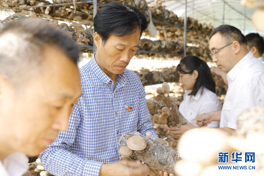 ??? 在第一書記郭旗(左二)的動員下,2019年9月,中國鐵路西安局集團(tuán)有限公司西安供電段黨員、干部到唐灣村幫助村民采摘豐收的香菇。新華網(wǎng)發(fā)(西安供電段駐唐灣村扶貧工作隊(duì)供圖)