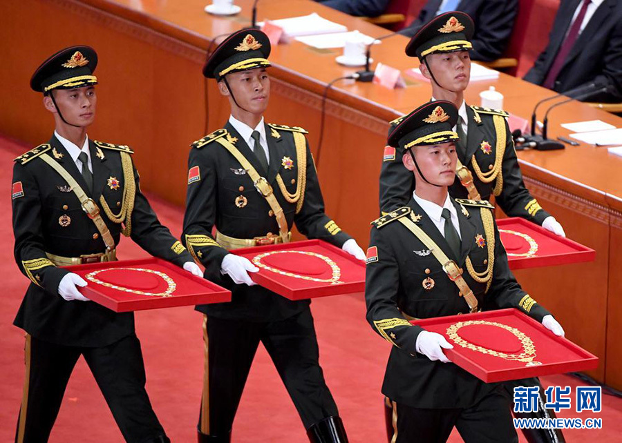6名號手吹響儀式號角,4名禮兵手捧共和國勛章、國家榮譽稱號獎章正步走上主席臺,鏗鏘的步伐在人民大會堂大禮堂內(nèi)久久回蕩。中華人民共和國國家勛章和國家榮譽稱號頒授儀式開始了。