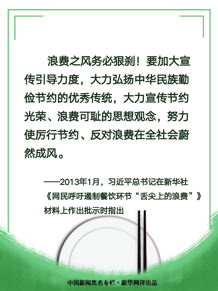 民以食為天,食以儉養(yǎng)德。餐飲浪費現(xiàn)象存在著巨大危害,全社會必須深刻認識勤儉節(jié)約的重要性。當務(wù)之急,各地各部門、各餐飲機構(gòu)、每個人都要行動起來,采取加強立法、強化監(jiān)管、加強宣傳教育等舉措,從我做起,從小事做起,進一步營造勤儉節(jié)約之風(fēng)。(文字:馬若虎 海報:張倩)