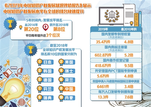 9月14日,中國國家知識產權局知識產權發(fā)展研究中心發(fā)布的《2019年中國知識產權發(fā)展狀況評價報告》顯示,中國知識產權發(fā)展水平在全球的排名快速提升,短短5年時間內,排名已從2014年的第20位,快速躍升至2018年的第8位,平均每年提升近3個位次。