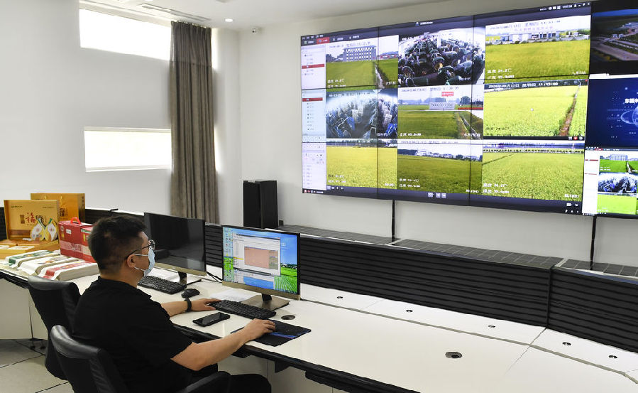 在吉林市昌邑區(qū)大荒地村,工作人員在東福米業(yè)現代農業(yè)信息化監(jiān)視指控中心通過監(jiān)控系統(tǒng)查看稻田情況(8月13日攝)。新華社記者 許暢 攝