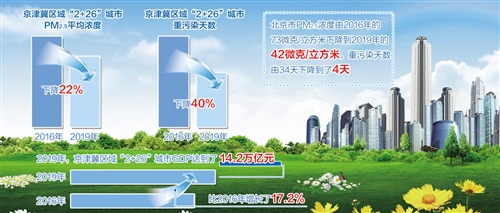 與2016年相比,2019年京津冀區(qū)域“2+26”城市PM2.5平均濃度下降了22%,重污染天數(shù)減少了40%。北京市PM2.5濃度由2016年的73微克/立方米下降到去年的42微克/立方米,重污染天數(shù)由34天下降到了4天。