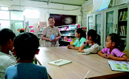 李翠利(中間)在“微光書苑”與孩子們交流。 受訪者供圖