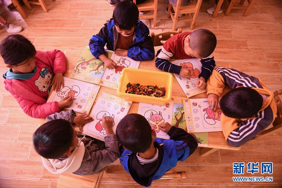 9月17日,在青海省果洛藏族自治州瑪沁縣拉加鎮(zhèn)中心幼兒園,孩子們正專心上著美術課。(新華網(wǎng)潘彬彬 攝)