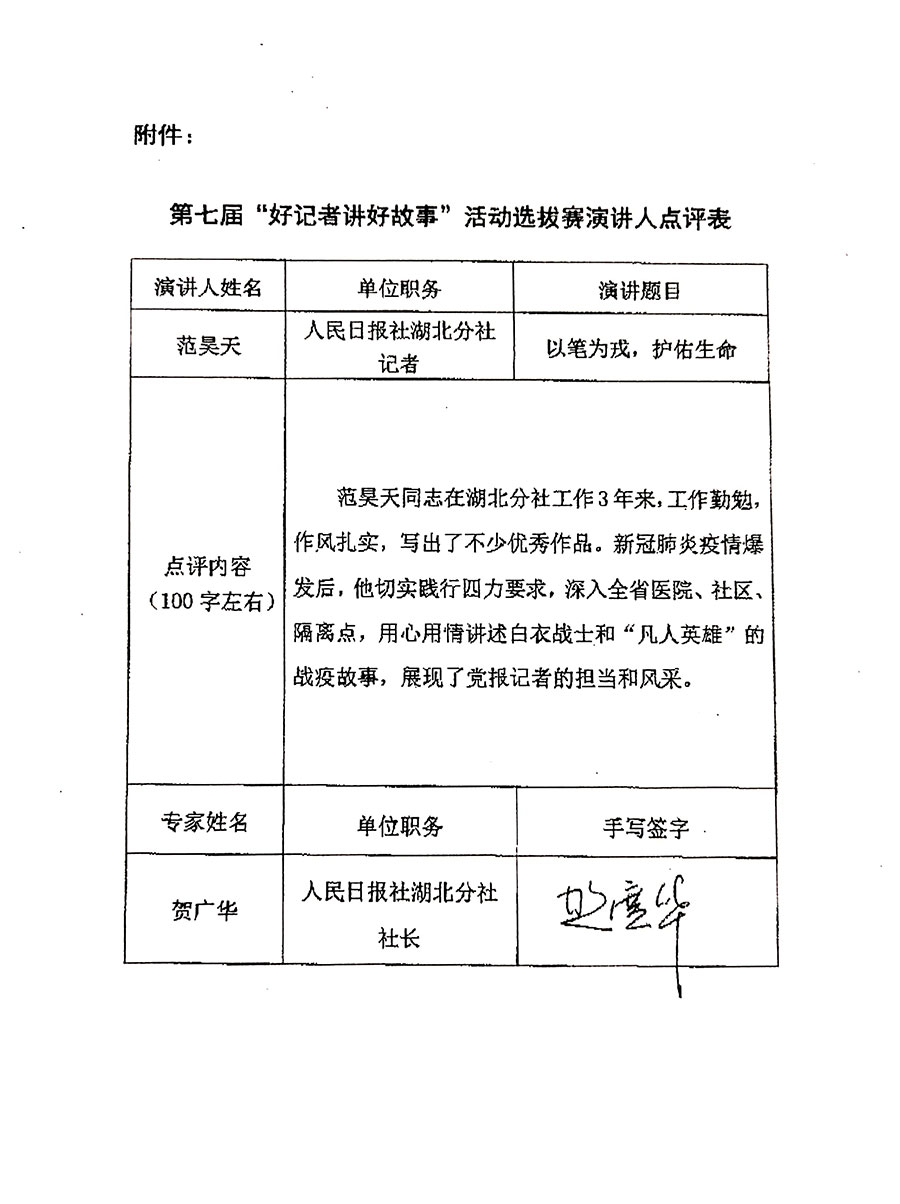 武漢爆發(fā)疫情以來,湖北分社“90后”記者范昊天同志就一直奮戰(zhàn)在疫情防控一線,深入全省醫(yī)院、社區(qū)、隔離點采訪,參與推出《武漢 分秒必爭抗疫情》《武漢保衛(wèi)戰(zhàn)打響關(guān)鍵之役》《八古墩社區(qū)的這場保衛(wèi)戰(zhàn)》《黃岡戰(zhàn)“疫”,防控更嚴(yán)更實更細(xì)》等數(shù)十篇實地探訪的獨家深度報道,還采寫呼吁各級干部下沉社區(qū)等多篇內(nèi)參,推動解決基層防控難題。疫情期間,他和同事們不斷上報“四類人員”信息,幫助大量患者得到妥善收治。2020年9月,隨分社榮獲“全國抗擊新冠肺炎疫情先進(jìn)集體”,本人獲得人民日報社抗疫先進(jìn)個人、武漢市抗疫先進(jìn)個人等榮譽。