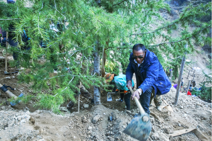 新冠肺炎疫情期間,巴拉格宗景區(qū)關(guān)閉,斯那定珠投入2000多萬購置了4萬多棵樹苗,帶領(lǐng)200多個(gè)員工在景區(qū)植樹。 索朗農(nóng)布/攝