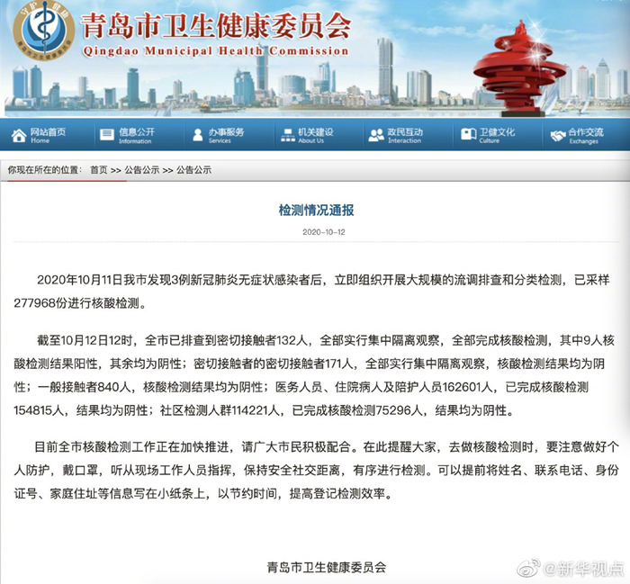 青島市衛(wèi)生健康委員會發(fā)布檢測情況通報稱,2020年10月11日我市發(fā)現(xiàn)3例新冠肺炎無癥狀感染者后,立即組織開展大規(guī)模的流調(diào)排查和分類檢測,已采樣277968份進(jìn)行核酸檢測。