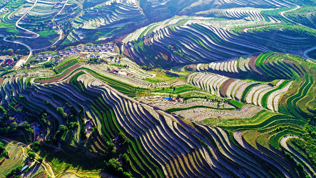 2019年6月9號(hào)拍攝于寧夏西吉縣偏城鄉(xiāng)上馬村。早上的太陽剛剛升起,照在薄膜地上猶如一道道發(fā)光的銀線,旱作梯田經(jīng)過改良,壯觀而又美麗。(蔡全錄攝)