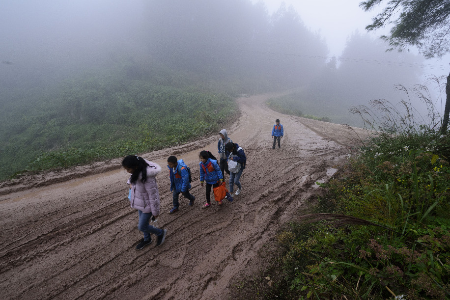 交通運(yùn)輸條件落后是重慶市貧困山區(qū)脫貧發(fā)展的制約短板。圖為重慶市綦江區(qū)橫山鎮(zhèn)水云軒小學(xué)生踩著泥濘道路上學(xué)場(chǎng)景。(楊奇 攝)