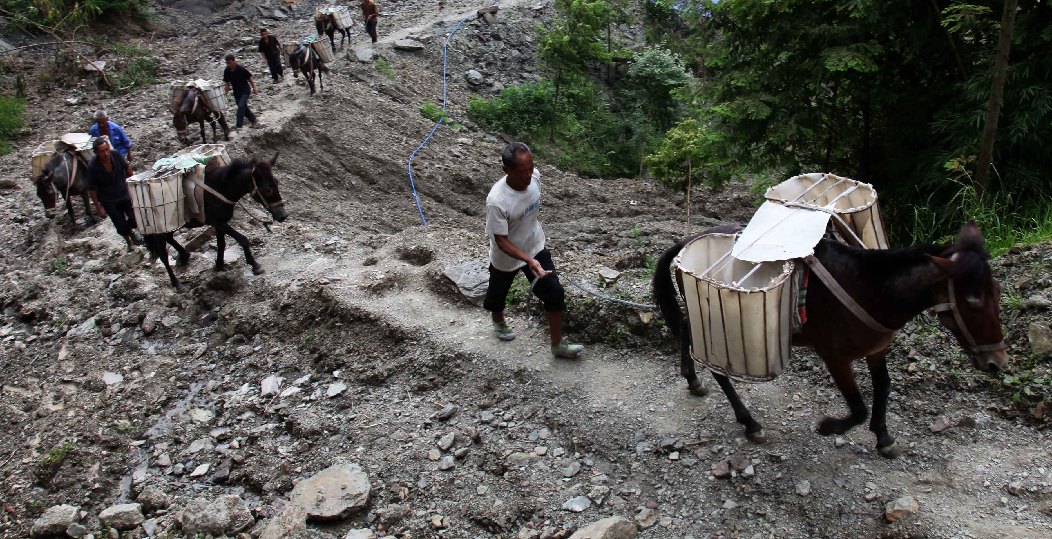 交通運(yùn)輸難問題突出,肩挑背磨和牲畜托運(yùn)是貧困山區(qū)物資運(yùn)輸?shù)闹饕绞?。圖為重慶市黔江區(qū)貧困鄉(xiāng)村馬幫運(yùn)輸農(nóng)用物資場(chǎng)景。(楊敏 攝)