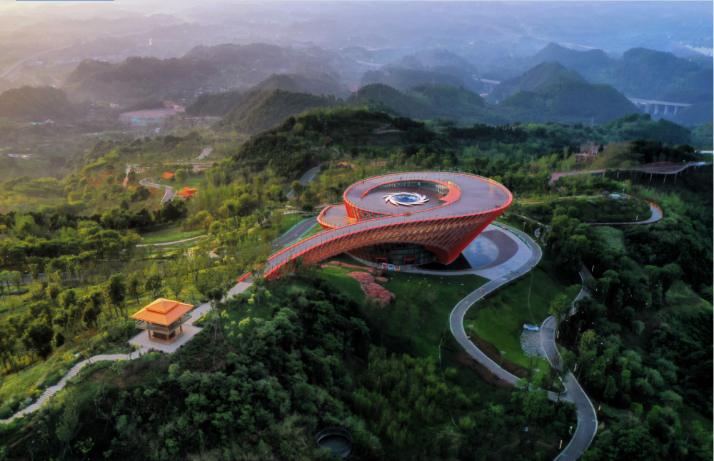 初秋的陽光映照下,遠(yuǎn)處龍泉山連綿起伏,像一幅巨型扇面展開。在天府新區(qū)公園城市展示廳,工作人員向本刊記者重溫了成都建設(shè)公園城市的緣起。