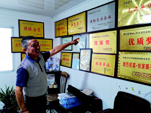 舒城縣五顯鎮(zhèn)石關(guān)蘭花茶葉專業(yè)合作社負(fù)責(zé)人龔世存向記者展示合作社獲得的榮譽(yù)(8月29日攝)。