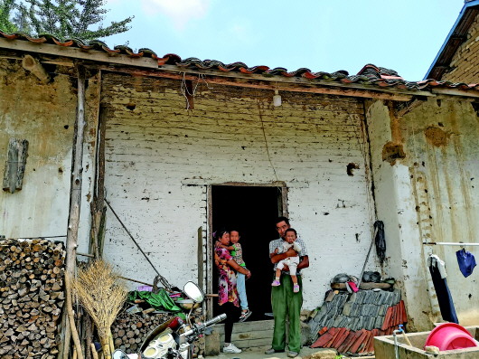 蘇平村珓子石組茶農(nóng)余本高一家四口站在老房子門前(8月29日攝)。