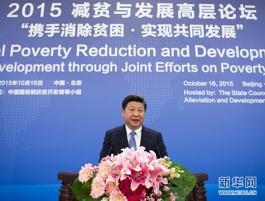 2015年10月16日,習(xí)近平在北京出席2015減貧與發(fā)展高層論壇并發(fā)表題為《攜手消除貧困 促進共同發(fā)展》的主旨演講,強調(diào)消除貧困是人類的共同使命。改革開放30多年來,中國走出了一條中國特色減貧道路。中國在致力于自身消除貧困的同時,積極展開南南合作,同舟共濟,攻堅克難,支持和幫助廣大發(fā)展中國家特別是最不發(fā)達國家消除貧困,為各國人民帶來更多福祉。 新華社記者 李學(xué)仁 攝