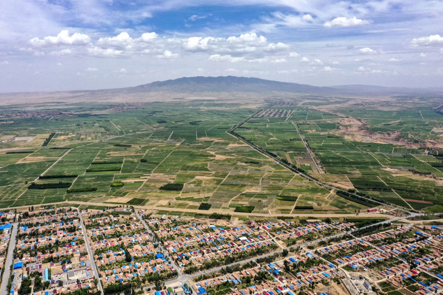這是6月23日拍攝的位于羅山腳下的寧夏吳忠市紅寺堡區(qū)一角(無人機照片)。新華社記者 馮開華 攝