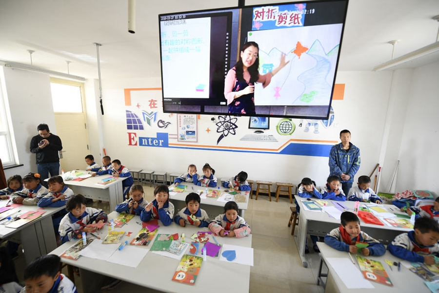 移民區(qū)的孩子在中衛(wèi)市中寧縣寬口井中石油希望學?!霸诰€課堂”上課(2018年3月27日攝)。新華社記者 王鵬 攝