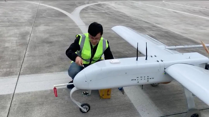 上圖為彭世濤在試飛一架用于測(cè)繪、航拍的民用無(wú)人機(jī)。