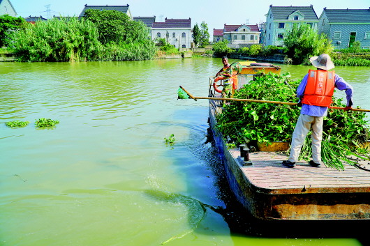 麻溪港上,保潔人員正在打撈水葫蘆。本報記者許舜達攝