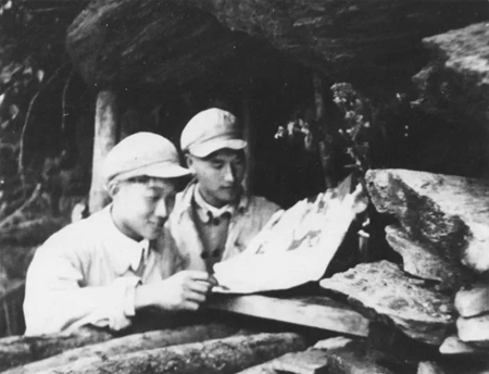 1951年抗美援朝第5次戰(zhàn)役期間,新華社記者李耐因隨軍(26軍)采訪,經(jīng)常露營(yíng),寫稿子也常是在樹下、路邊或臨時(shí)搭起的棚子里。這是記者李耐因(右)在臨時(shí)搭起的防空棚下,向軍隊(duì)參謀人員請(qǐng)教戰(zhàn)況。